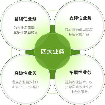 振兴农业集团主要依托全县农业产业,通过整合县级各部门的优势资源,科学参与市场经营。按照现代企业经营体制机制,努力做大企业规模、做强优势产业、做好企业经营、做优企业业绩的工作思路,一是为农业产业发展提供基础性配套设施为基础性业务,二是以推介营销巫山优质特色农副产品为支撑性业务,三是以发展农业精深加工走农业工业化路径为突破性业务,四是以提供农业技术、农资配送等农业生产社会化服务为拓展性业务,贯穿全县一二三全产业链各环节,兼顾资本运作与社会公益性服务,全力打造为全县国有标杆性龙头企业。